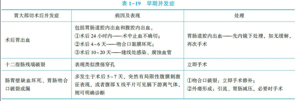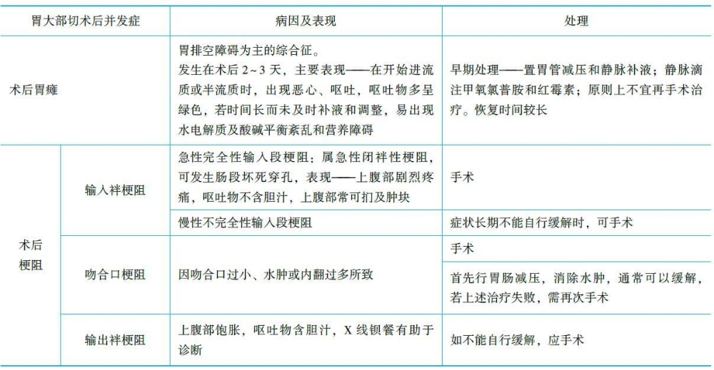 (1)早期:①=1\*GB3术后出血;②十二指肠残端破裂;③肠胃壁缺血坏死、胃肠吻合口破裂或漏;④胃瘫;⑤术后梗阻。