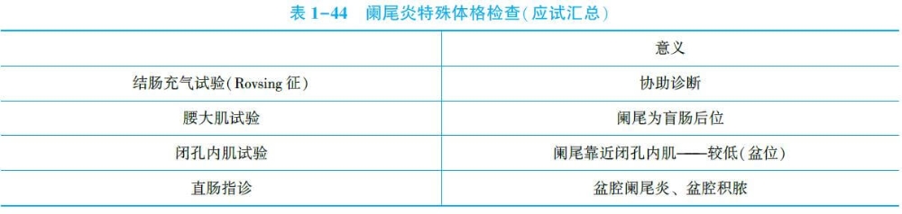 (2)腹膜刺激征:腹肌紧张、反跳痛和肠鸣音减弱或消失等,提示阑尾炎已发展到化脓、坏疽或穿孔的阶段。