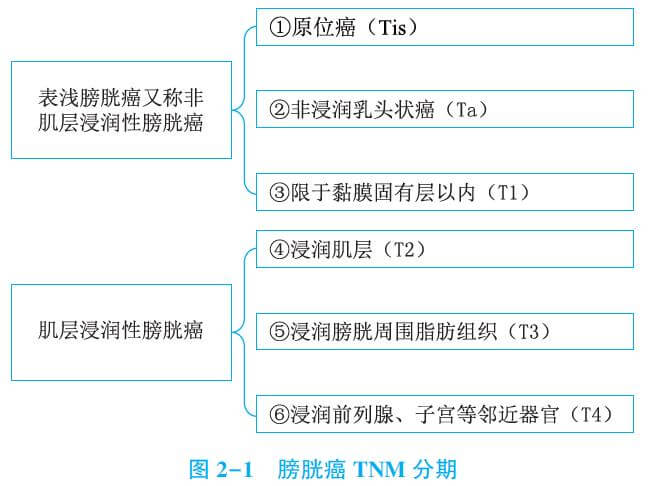 2.病理类型 上皮性肿瘤(瘤和癌)占95%以上,其中90%为移行细胞乳头状癌;鳞癌和腺癌恶性程度较高。非上皮性肿瘤:罕见,多为肉瘤,如横纹肌肉瘤,好发于婴幼儿。