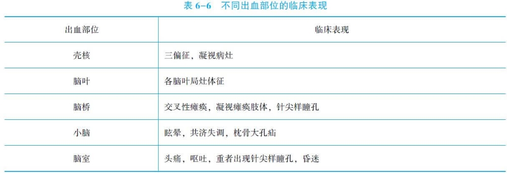 2.临床表现 发病年龄常在50岁以上,多有高血压病史,寒冷季节发病较多。多突然起病,起病前多无预感。多在白天起病,过劳、大便用力、兴奋或激动常为诱因。全脑症状为出血、水肿、高颅压所致,表现为剧烈头痛、呕吐、意识障碍(嗜睡-昏迷)。局灶性症状表现为中枢性偏瘫、面瘫、舌瘫、交叉瘫、失语、感觉障碍等。不同部位的脑出血其临床表现除上述的共同点外,各有其特点: