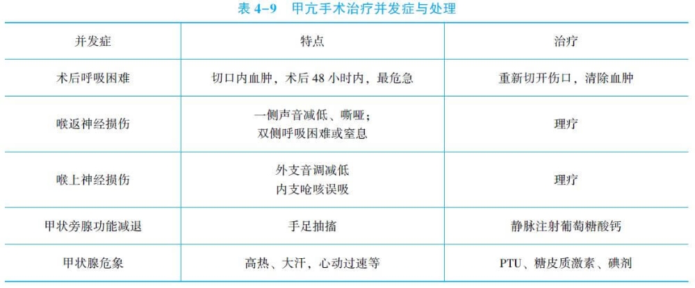 (5)甲状腺危象:多发生于术后36小时以内,病情凶险。表现为高热(>39℃)、脉速(>120次/分)、大汗、烦躁、昏迷。发生前可用静脉滴注碘剂预防,发生后继续用碘剂、镇静剂、氢化可的松、降温治疗。