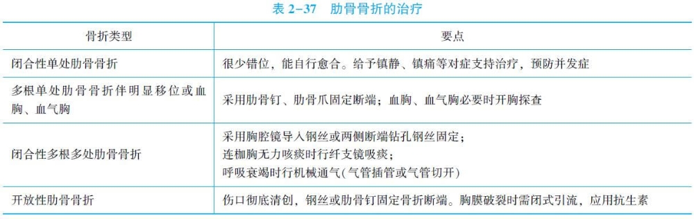 1.闭合性单处肋骨骨折处理止痛、固定胸廓和预防肺并发症。