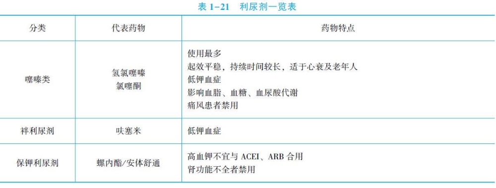 (3)分类特点:有噻嗪类、袢利尿剂和保钾利尿剂三类。①噻嗪类:应用最普遍,但长期应用可引起血钾降低及血糖、血尿酸、血胆固醇增高,糖尿病及高脂血症患者宜慎用,痛风患者禁用;②保钾利尿剂:可引起高血钾,不宜与ACEI合用,肾功能不全者禁用;③袢利尿剂:利尿迅速,肾功能不全者应用较多,但过度作用可致低血钾、低血压。