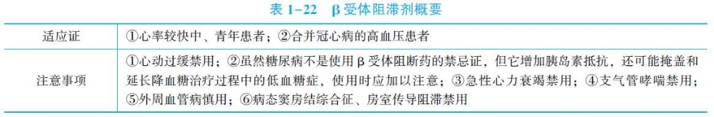 (3)注意事项:①β受体拮抗剂对心肌收缩力、窦房结及房室结均有抑制作用,因此,心动过缓:病态窦房结综合征、房室传导阻滞患者禁用;②虽然糖尿病不是β受体阻断药的禁忌证,但该类药物能增加胰岛素抵抗,还可能掩盖和延长降血糖治疗过程中的低血糖症,使用时应加以注意;③急性心力衰竭禁用;④支气管哮喘;⑤慢性阻塞性肺病、运动员、外周血管病或糖耐量异常者慎用。