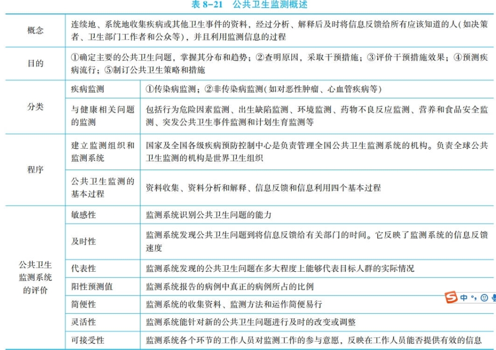 1.概念 疾病监测是指连续地、系统地收集疾病的资料,经过分析、解释后及时将信息反馈给所有应该知道的人,并且利用监测信息的过程。
