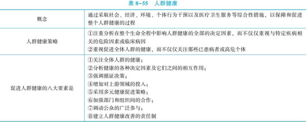 3.社区卫生 人群健康的策略和原则在社区水平上的具体应用,强调通过社区预防服务,针对社区需优先解决的健康问题,以全体社区居民为对象开展疾病预防和健康促进活动来促进社区的整体健康。