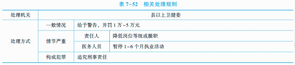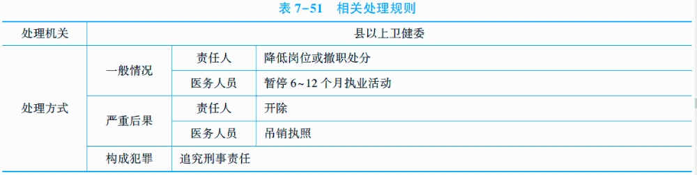 由县以上卫生行政部门没收违法所得,罚款5万~10万元,对直接责任人降低岗位等级,医务人员暂停执业6~12个月,情节严重直接责任人开除处分,医务人员吊销执业证书。