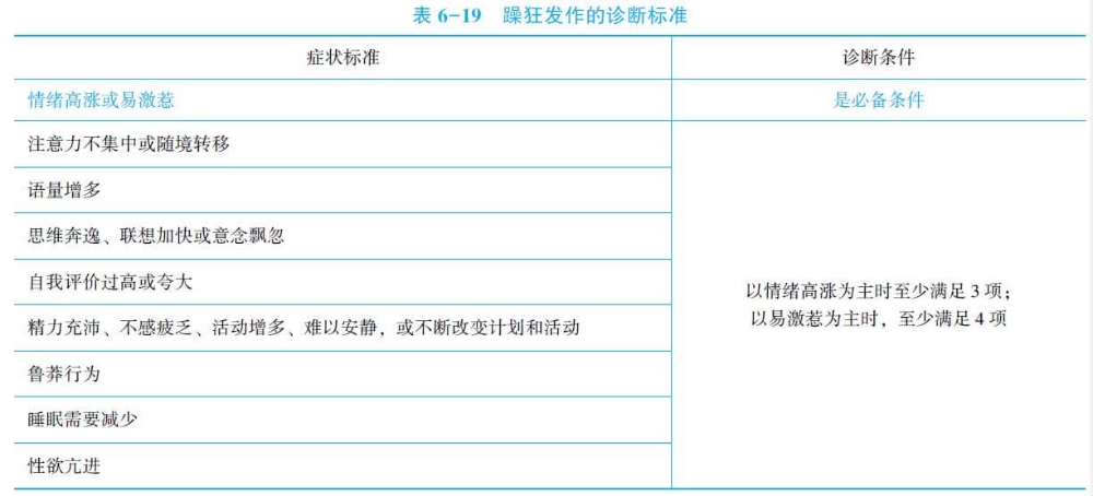 2)可以存在某些分裂性症状,但是不符合分裂症的诊断标准。如果同时符合分裂症的症状标准,在分裂症状缓解后,至少满足躁狂发作标准1周。
