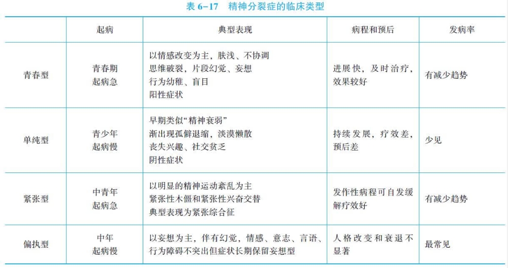 1.单纯型 青少年期发病,起病缓慢,临床表现为日益加重的孤僻、被动、生活懒散和情感淡漠。幻觉妄想不明显。此型患者在发病早期常不被注意,可被误认为不开朗或性格问题、往往经过数年病情发展至较严重时才被发现。治疗效果与预后较差。