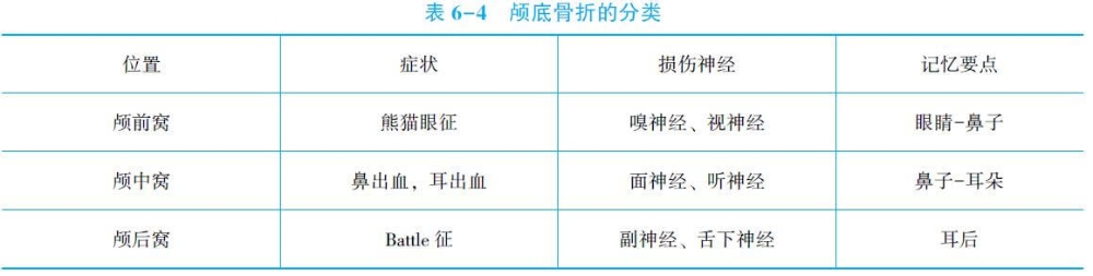 1.临床表现 颅底部的线形骨折多为颅盖骨折延伸到颅底,也可由间接暴力所致。根据发生部位可分为:颅前窝骨折、颅中窝骨折和颅后窝骨折。