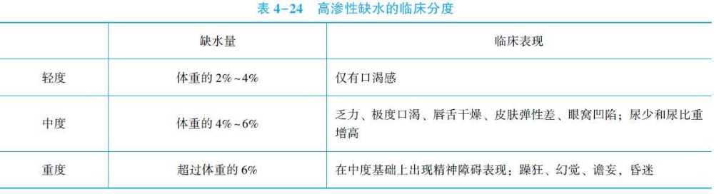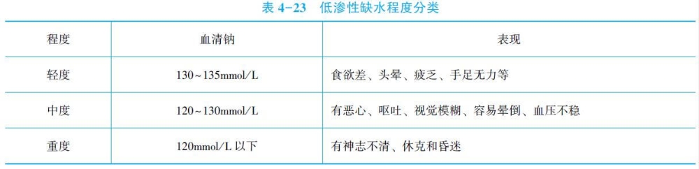 2.临床表现 主要为低钠的表现,一般均无口渴感。根据缺钠程度,低渗性缺水可分为三度。