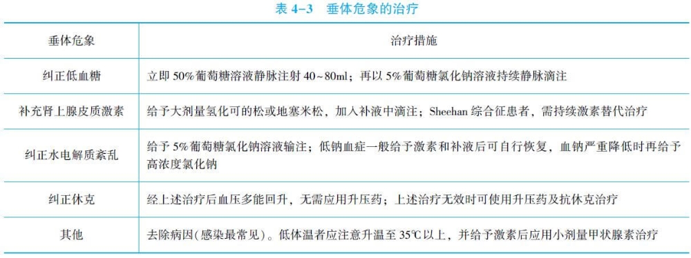 3.垂体危象 各种应激如感染(主要诱因)、劳累、中断治疗、腹泻、呕吐、手术及药物(镇静催眠药)等可诱发,表现为严重低血糖,神志障碍,休克,厌食、恶心、呕吐等胃肠道症状,低温(<30℃),循环衰竭,水、电解质紊乱等,需立即抢救治疗。Sheehan综合征最易发生垂体危象。