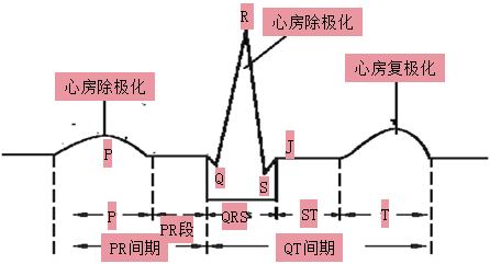 T波 心室快速复极过程时的电位变化 - 振幅:最高不超过1.5mv(不会超过3大格或15小格),最低不低于1/10R波 PR间期 心房开始去极到心室开始去极 0.12~0.20s即3~5小格 - RR间期 表示一次心动周期的时间 0.6~1.0s(心率=60~100次/分),即宽15~25小格或者3~5大格 RR间期 ST段 心室缓慢复极过程 - ST段