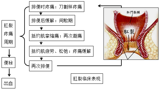 ·典型的临床表现——肛门疼痛、便秘和出血。