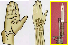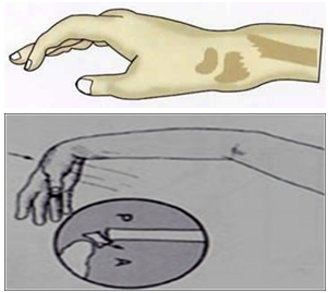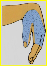 | 伸直型 | 肘部向后突出并处于半屈位 | 肘前方 |
