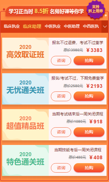 2019年临床执业助理医师成绩公布,也就是说2019年临床执业助理医师考试告一段落,2020年临床执业助理医师考试备考正式开启!同样,医学教育网为大家送来2020年临床执业助理医师的优惠课程,请查收!
