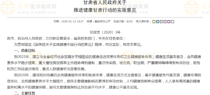 医学教育网小编从甘肃省人民政府发布的《甘政发〔2020〕3号》推进健康甘肃行动的实施意见可知,甘肃省在10年内要增加万名执业和助理医师人数,要保障全科医师的待遇、农村医学生的编制,我们一起看看吧!