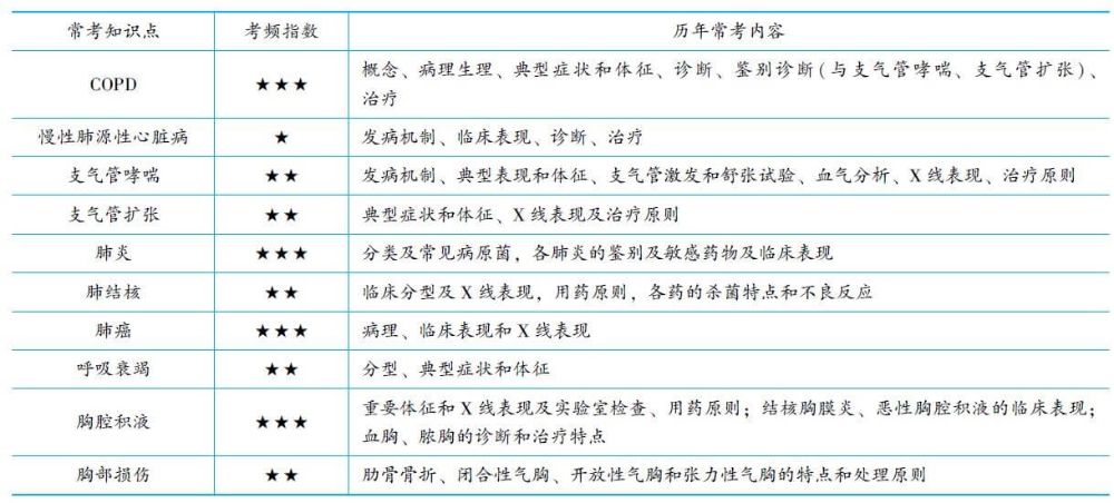 2.其次,突出重点 呼吸系统的重点在临床常见疾病,哪些是临床多见疾病,哪些就是医师考试的内容。例如慢性阻塞性肺疾病,肺源性心脏病,哮喘,肺炎,肺结核都是年年出题的常考点,希望能认真掌握。
