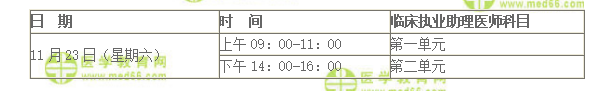2019年在天津、吉林、上海、江苏(新增)、福建、湖南(新增)、广东(新增)、广西、海南、贵州、云南、宁夏(新增)12个地区开展临床执业医师、临床执业助理医师、具有规定学历的中医执业医师和具有规定学历的中医执业助理医师综合笔试“一年两试”试点。在试点考区通过当年实践技能考试,但未通过第一次医学综合笔试且无违纪违规行为的考生可报名参加第二次医学综合笔试(含缺考考生)。考试时间为11月23日: