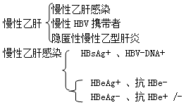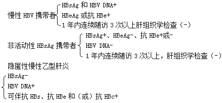 注:另约20%隐匿性慢性乙型肝炎患者除HBV DNA阳性外,其余HBV血清学标志均为阴性。诊断需排除其他病毒及非病毒因素引起的肝损伤。