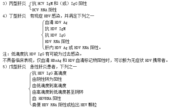 (1)甲型肝炎:抗HAV IgM阳性;粪便中检出HAV颗粒或抗原或HAV RNA。