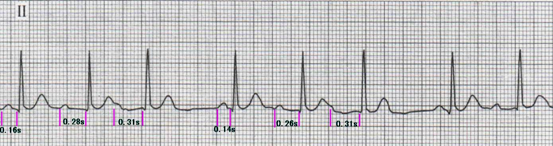 心室漏搏前P-R间期固定不变。(可正常可延长)。