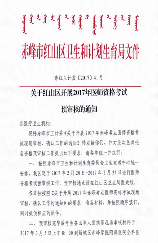 2017内蒙赤峰红山区医师资格考试预审核通知: