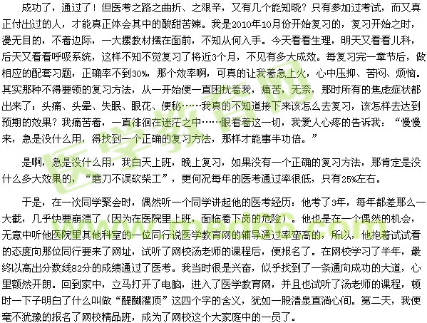 我的网校我的家,希望那些参加医考的同仁们,特别是那些付出了很多很多努力,却收效甚微的考生朋友们,都能来我们网校看看,你们定会有意想不到的收获,定会和我一样梦想成真,尽管过程很艰辛。