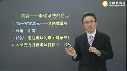 教师简介:医学教育网医学总监,医学硕士。他讲课风格鲜明,内容上坚持“不择一切手段记住重要知识点”的教学思路,综合运用表格、口诀、图片、FLASH和图示等多种手段强化重要考点;形式上绝对摒弃平铺直叙式的讲述,而是将枯燥的医学知识跟常见事物联系起来,力求生动活泼,深入浅出。