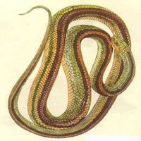 体全长可达2.5m以上。体背绿褐或棕黑色及棕褐色;背部正中有一条黄色的纵纹;体侧各有两条黑色纵纹,至少在前段明显(成年个体),至体后部消失(有的个体是通身墨绿色的,有的前半身看上去是黄色,后半身是黑色)。次成体通身纵纹明显。头颈区别显著;吻鳞自头背可见,宽大于高;鼻间鳞为前额鳞长的2/3;顶鳞后有两枚稍大的鳞片;上唇鳞8,第七枚最大;下唇鳞8~10;背鳞鳞行成偶数16-16-14,中央2~4行起强棱,腹鳞雄192~204,雌191~205;肛鳞二分;尾下鳞雄95~137对,雌98~131对。