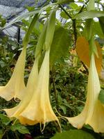 茎粗壮直立,.主茎常木质化。株高50~150cm,全株光滑无毛,有时幼叶上有疏毛。上部常呈二叉状分枝。叶互生,叶片宽卵形,边缘具不规则的波状浅裂或疏齿,具长柄。脉上生有疏短柔毛。花单生在叶腋或枝叉处;花萼5齿裂筒状,花冠漏斗状,白色至紫色。蒴果直立,表面有硬刺,卵圆形。种子稍扁肾形,黑褐色。花单生叶腋,花冠漏斗形,长7~10cm,筒部淡绿色,上部白色;花冠带紫色晕者,为紫花曼陀罗。花期夏、秋季。播种法繁殖。