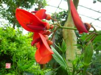 木蝴蝶大乔木,高7-12m。树皮厚,有皮孔。小枝皮孔极多而突起,叶痕明显而大。叶对生;大型奇数二至四回羽状复叶,着生于茎干近顶端,长60-160cm,宽20-80cm;小叶多数,小叶柄长5-10mm,小叶片三角状卵形,长6-14cm,宽4-9cm,先端短渐尖,基部圆形或宽楔形而偏斜,全缘,上面绿色,下面淡绿色,两面无毛,干后发蓝色。总状聚伞花序顶生,长40-150cm,花梗长约7cm;花萼钟状,长2.2-4.5cm,宽2-3cm,紫色,先商平截,宿存;花冠橙红色,肉质,长3-9cm,钟形,直径5-8.5cm,先端5浅裂,裂片大小不等;雄蕊5,插生于花冠筒中部,伸出于花冠外;花丝基部被绵毛,其中1花丝较短;花盘磊,肉质;花柱长5-7cm,柱头2片开裂。蒴果木质,扁平,阔线形,下垂,长40-120cm,宽5-8.5cm,先端短尖,基部楔形,边缘稍内弯,中间有一条微突出的背缝,成熟时棕黄色,沿腹缝线裂开,果瓣具中肋。种子多数,种子连翅长6-7.5cm,宽3.5-4cm,除基部外,全被白色半透明的薄翅包围。花期7-10月,果期10-12月。