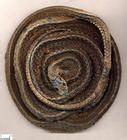 该品呈圆盘状,盘径约16cm。表面黑褐色或绿黑色,密被菱形鳞片;背鳞行数成双,背中央2~4行鳞片强烈起棱,形成两条纵贯全体的黑线。头盘在中间,扁圆形,眼大而下凹陷,有光泽。上唇鳞8枚,第4、5枚入眶,颊鳞1枚,眼前下鳞1 枚,较小,眼后鳞2 枚。脊部高耸成屋脊状,俗称剑脊。腹部剖开边缘向内卷曲,脊肌肉厚,黄白色或淡棕色,可见排列整齐的肋骨。尾部渐细而长。尾下鳞双行。剥皮者仅留头尾之皮鳞,中段较光滑。气腥,味淡。