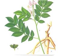 芸香科植物白鲜为多年生草本,基部木质,高达1m。全株有特异的香味。根肉质,多侧根,外皮黄白至黄褐色。奇数羽状复叶互生;叶轴有狭翼,无叶柄;小叶9-13,叶片卵形至椭圆形,长3.5-9cm,宽2-4cm,先端锐尖,基部楔形,边缘具细锯齿,上面深绿色,密布腺点,下面白绿色,腺点较稀。总状花序顶生,长达30cm,花轴及花柄混生白色柔毛及黑色腺毛;花柄长1-2.5cm,基部有线形苞片1枚;萼片5,卵状披针形,长约5mm,宽约2mm,基部愈合;花瓣5,色淡红而有紫红色线条,倒披针形或长圆形,长约25mm,宽5-7mm,某部渐细呈柄状:雄蕊10;子房上位,5室。蒴果,密被腺毛,成熟时5裂,每瓣片先端有一针尖。种子2-3 颗,近球形,直径约3mm,先端短尖,黑色,有光泽。花期4-5月,果期6月。