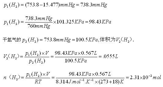 例题:1-4、某学生在实验室中用金属锌与盐酸反应制取氢气。所得到的氢气用排水集气法在水面上收集。温度为18℃,室内气压计为753.8mmHg,湿氢气体积为0.567L.用分子筛除去水分,得到干氢气。计算同样温度\压力下干氢气的体积以及氢气的物质的量。