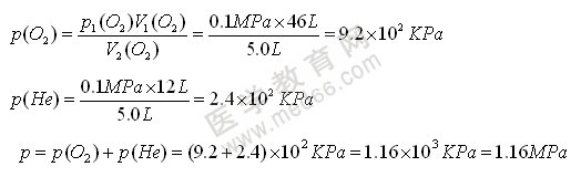 例题:1-3、在潜水员自身携带的水下呼吸器中充有氧气和氦气混合气体(氮气在血液中溶解度较大,易导致潜水员患上气栓病,所以以氦气代替氮气)。对一特定的潜水操作来说,将25℃,0.10Mpa的46LO2和25℃,0.10Mpa的12Lhe充入体积为5.0L的储罐中,计算25℃下在该罐中两种气体的分压和混合气体的总压。
