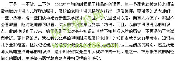 从那以后,我更坚定了我的信心,更加的有斗志去面对医师考试,心里窃喜终于有了一洗雪耻的机会了。几乎,每天抽时间按时学习课程,而且,网校的老师无微不至的打电话和我进行交流和督促,并加上网校里面的海量题库进行测试,每个题后面的讲解都很细致入微,如果实在不会,还可以给网校的老师留言,老师总会在一天不到的时间里给我做出了详细答复。我真的太庆幸遇见了一个这样的网校,不然,今年和去年是一样的悲剧。
