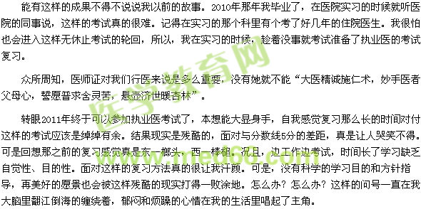 此时,脑海浮现出很多往事。之前我已经经过了一次医师考试,所以,在成绩没有查出来之前各种压抑各种郁闷一直充斥着我的生活。估计许多过来人都能体会,二进宫的我们是背负着怎样的心情去面对这样的考试和生活。脸上已不再写的是初生牛犊不怕虎的稚气,而是已经被这样的考试洗礼的千疮百孔。是的,面对浩瀚的医学知识,我们总是像无头苍蝇一样去对付这样重要的考试,结果总是乘兴而来败兴而归。直到遇见了医学教育网后对付执业医的考试不再是两袖清风的走出考场。