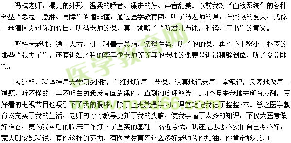 “千呼万唤始出来,推得云开见月明”经过漫漫的98天的等待,医考成绩终于出来了!我考过了!我再次感谢正保远程教育,感谢医学教育网的老师!在此我想起了罗蒙诺索夫说过:“不是水滴能穿岩石,而是水滴不断落在岩石上,天资尽管不聪明,不断研读终能学好。”任何考试,只要你努力付出,只要你坚持不放弃,成功必将属于我们。愿更多的考生能认识正保远程教育,愿更多的医学生受益于医学教育网!我考过后,同事及朋友问我考过的秘诀是什么,我骄傲地告诉他们:是努力,是坚持,是家人的支持,是医学教育网让我美梦成真!