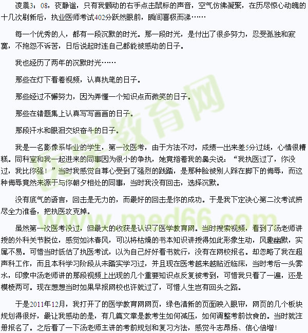 在执业医师考试的两年战役里,我收获的不仅仅是分数,还有执着、耐力、克制力,以及那种不服输的精神,我成长了,也成熟了。