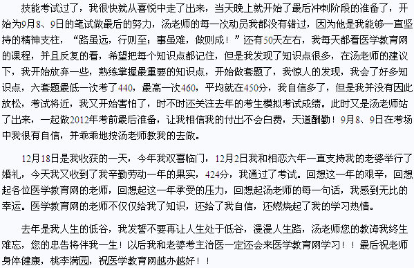 时间过得很快,2012年3月份报名,四、五、六月份的积极准备,7月份到来了,六月初我就开始了技能考试的准备,因为已经失败过一次了,我不想重蹈覆辙,准备的很早,此时我虽然很努力的准备,但是毕竟很久没有上临床了,我有点开始害怕操作了,我怕我做不好,怕我遇到我没有做过的操作。在我对自己产生怀疑的时候,又是看见汤老师在授病理班冲刺课时引用的“有志者事竟成,破釜沉舟,百二秦关终属楚:苦心人天不负,卧薪尝胆,三千越甲可吞吴。”通过我精心的准备,我把所有的知识点都弄懂了,并且自己一有空就开始自己给自己出病例题,准备了小本,不断地将汤老师说的问诊步骤和病例分析思路加以强化,希望在考场上做到万无一失,由于条件有限,我没有把所有的技能操作过一遍手,但是我把视频都看清楚了,并且熟练了步骤,得知成都有医学教育网的面授培训班后,我积极的参加了培训,当天还是我最好的兄弟结婚,但是我还是选择了现场培训,通过医学教育网两天的培训,我自信心又增加了。