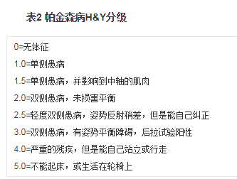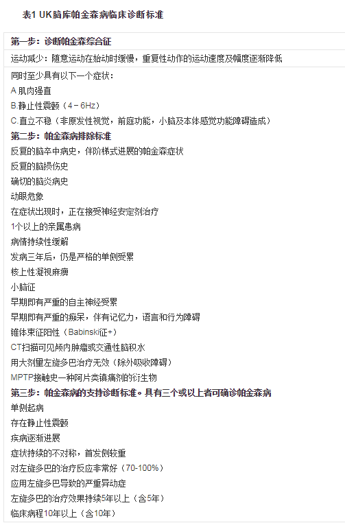 英国脑库帕金森病诊断标准见表1.帕金森病的严重程度一般可采用H&Y(Hoehn & Yahr)分级来评估。