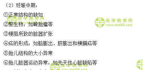 (1)妊娠早期:评估胎龄及胎儿的生长。妊娠早期阴道超声检查还可用于观察胎儿肢芽、腹部、颅脑及心脏的结构。