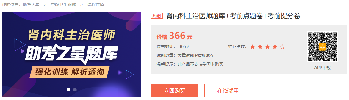 参加肾内科主治医师考试的考生,都在为了如何更好备考而绞尽脑汁,想要多做题,查缺补漏?想多做好题,提升应试技能?肾内科主治医师考试好帮手,医学教育网助考之星题库软件来袭!