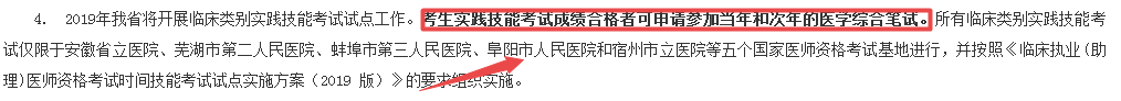 回答:在安徽2019年医师现场审核公告中提到,临床技能新三站试点考试考试成绩合格者可申请参加当年和次年的医学综合笔试,也就是说成绩2年有效。安徽和湖北试点目前公布的考试时间为6月10日-23日!