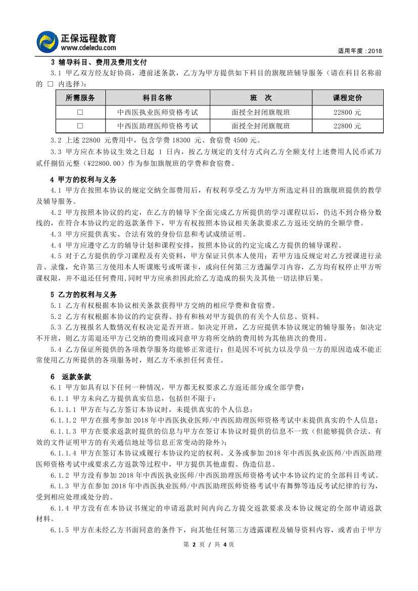 2018年中西医医师面授全封闭旗舰班学员协议书