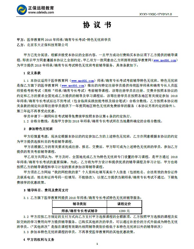 2018年中医师承/确有专长考试“特色无忧班”协议书