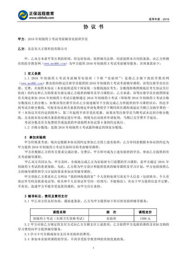 初级药士考试“实验班”协议书