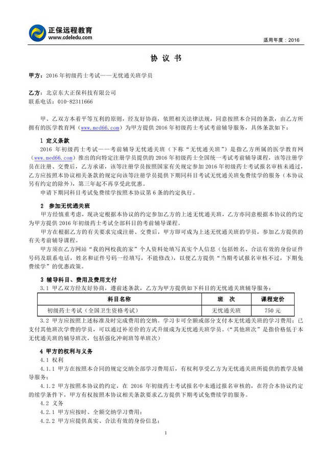 初级药士考试“通关班”协议书