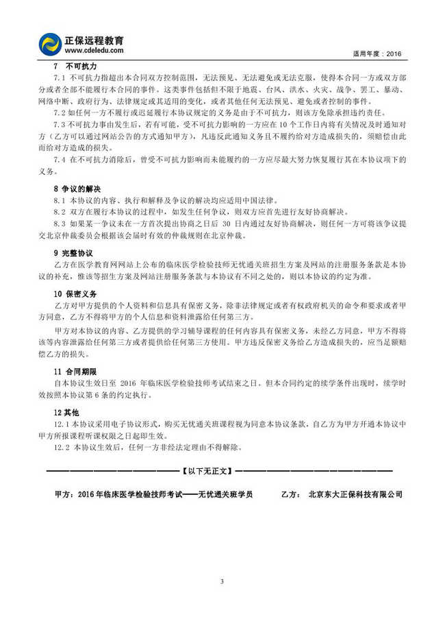 临床医学检验技师考试“无忧通关班”协议书